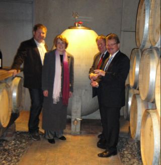 Bildunterschrift: Ludwig Knoll, Annette Karl, Volkmar Halbleib und Dr. Paul Wengert vor einem Fass aus Sichtbeton, im dem Ludwig Knoll bereits zum zweiten Mal Silvaner ausbaut.