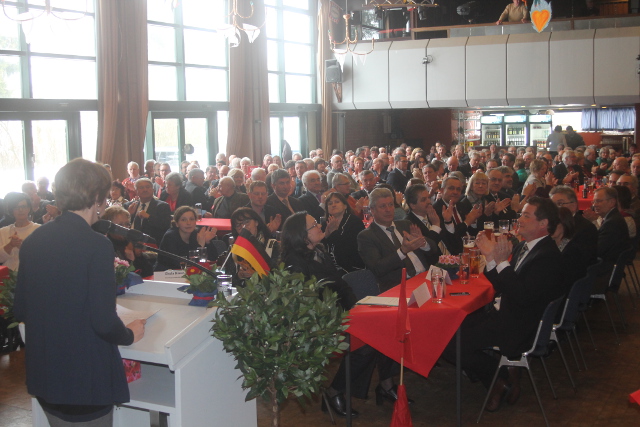 Arbeits- und Sozialministerin Andrea Nahles braucht viel Geduld. Vor und nach ihrer Rede strömen die Gäste zu der SPD-Politikerin: Autogramme von und Fotos mit ihr sind heiß begehrt. Für die Genossen ist Nahles offenbar einer der großen Stars. Oder wie es SPD-Landtagsabgeordnete Annette Karl ausdrückt: "Wir haben hier eines der Aushängeschilder der Bundesregierung bei uns. Sie ist für mich das Gesicht für soziale Gerechtigkeit und auskömmliche Löhne."