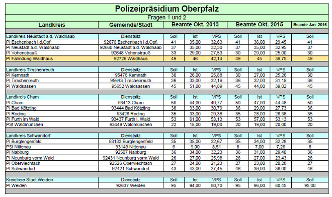 „Es ist besonders enttäuschend, dass sich in den letzten zwei Jahren bei dem Auffüllen der Lücken nichts getan hat, sondern die Lücken eher größer werden.“, so Karl mit Blick auf die Entwicklung der Zahlen von Oktober 2013 auf Oktober 2015. „Dies ist ein Schlag für das Sicherheitsgefühl der Bürgerinnen und Bürger, auch vor dem Hintergrund, dass sich im letzten Jahr viele hundert Bürger für den Erhalt ihrer Polizeiinspektion Vohenstrauß eingesetzt haben und auch der sogenannte „Eiserne Schutzmann“ in Kemnath immer wieder in der Kritik bei der Bevölkerung steht.“
