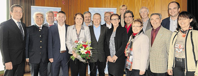 Annette Karl (Fünfte von links) darf sich gestärkt fühlen. Bei den Neuwahlen des Kreisvorstands enthielt die Chefin 70 Ja-Stimmen sowie eine Nein-Stimme bei einer Enthaltung. Auch die Stellvertreter schnitten gut ab. Uli Grötsch brachte es auf 71 Ja-Stimmen, Hans Kick auf 67, Jürgen Kürzinger auf 69, Maria Sauer auf 71 und Bernhard Stangl ebenfalls auf 71 Stimmen. Der bisherige stellvertretende Kreisvorsitzende Helmut Fastner gab seinen Posten ab und wurde mit 69 Ja-Stimmen zum neuen Vertreter der Arbeitsgemeinschaft „60 plus“ gewählt.