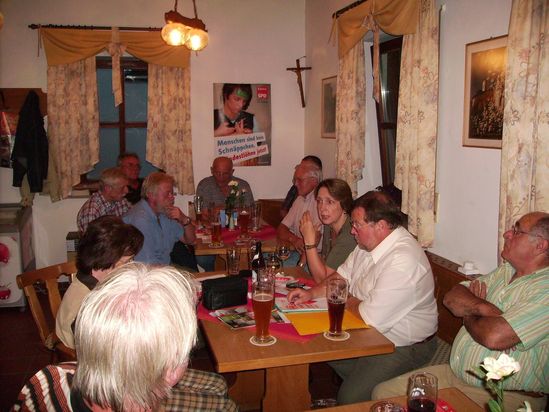 Vorsitzender Franz Witt begrüßte neben der SPD-Kreisvorsitzenden auch den Bezirkstagskandidaten Bürgermeister Werner Windisch und er wünschte sich, dass unser Stimmkreis im neuen Landtag seitens der SPD nach fünfjähriger Vakanz wieder vertreten sein sollte. „Dafür sei Annette Karl die richtige und qualifizierte Kandidatin. Dazu brauchen wir eine starke SPD, die für frischen Wind in der bayerischen Politik sorgt und das Land in eine bessere Zukunft führt“, so Witt. Die Landtagskandidatin freute sich eingangs ihrer Rede darauf hinweisen zu können, dass „die Freizeitanlage unter SPD-Bürgermeister Gerd Werner geschaffen wurde und neben der Umfahrung mit Mühlbergtunnel sowie weiteren Großbauten zu dessen Errungenschaft für Neustadt gehören“. Die Landtagswahl sei nach den Worten von Karl insofern entscheidend, um nach 51 Jahren CSU-Herrschaft einer gerechten Politik Platz zu verschaffen. Es müsse sich etwas verändern in unserem Land, weg von der Arroganz hin zu einer Politik für den Menschen. Zwei Themen ihrer vielen Anliegen seien Bildung als Investition in die Zukunft sowie eine umfassende Familienpolitik. Sie fordere eine individuelle Förderung statt Auslese, kleine Klassen mit ausreichend Lehrern. Annette Karl als Mutter von vier Kindern wisse, wo von sie spreche, man müsse bei den Kleinstkindern anfangen und das letzte Kindergartenjahr als Vorschule müsse zudem kostenfrei sein. „Dies sei jedoch einzig und allein Aufgabe des Freistaates, nicht der Kommunen“, stellte Karl klar. Weiter führte die SPD-Landtagskandidatin aus, dass es „ in unserer Region immer noch an qualifizierten Arbeits- und Ausbildungsplätzen fehle. Jammern helfe dabei jedoch nicht weiter. Dass nicht gejammert werde, zeige die finanzielle Vorarbeit seitens der Wirtschaft, der Gewerkschaften, der Stadt Weiden und der Bevölkerung bei der geplanten HAW-Erweiterung. Nach dem Debakel der voreiligen Bauzusage von Staatsminister Goppel glaube Annette Karl erst nach der Verabschiedung des nächsten Landtagshaushalts- mit einem Titel für die HAW- Erweiterung drin- an den Erfolg in dieser Sache. Von den 460 Millionen Euro aus dem gescheiterten Transrapidprojekt sei nichts in der Nordoberpfalz angekommen, dabei habe selbst der „Further Drache“ 4 Millionen Euro Zuschuss bekommen. Sie plädierte auch für gerechte Mindestlöhne, „denn wer arbeitet, der soll auch davon leben können“ stellte sie fest. „Wen die CSU von Mindesteinkommen rede, ist das lange nicht ein Mindestlohn“. In punkto Energie gebe es mit der SPD keine Verlängerung der Laufzeiten bei den Atomkraftwerken. „Die Atomtechnologie sei eine Belastung für alle zukünftigen Generationen“ wies Karl hin und sie plädierte für den Ausbau erneuerbarer Energien, die auch der größte Jobmotor in Deutschland sind.. Karl setzte sich zudem für ein „Barrierefreies Bayern“ für die Jungen und Senioren ein, wobei bei Bahnhofsanierungen ein behindertengerechter Zugang zu den Bahnsteigen und Zügen gewährleistet sein müsse. Bezirksrat und Bürgermeister Werner Windisch nutzte beim Dämmerschoppen die Gelegenheit, die Leistungen und Aufgaben des Bezirks aufzuzeigen. „Stark sein für die Schwachen“ sei die Devise der SPD-Bezirkstagsfraktion bisher gewesen und wird es auch bleiben, war das Fazit von Windisch. Er plädierte für eine weitere Dezentralisierung von psychiatrischen Einrichtungen und dem Ausbau der Standards im Sozialbereich. Daneben sollte wieder eine Mitgliedschaft im Kommunalen Arbeitgeberverband für die MedBo gGmbh erreicht werden, damit für die Beschäftigten der Tarifvertrag des öffentlichen Dienstes ohne Einschränkungen gelte. Dazu bedürfe es aber auch am 28. September für eine starke SPD-Bezirkstagsfraktion und eine soziale bürgernahe Politik zu werben. Eine angeregte Diskussion mit den beiden Kandidaten schloss sich an.