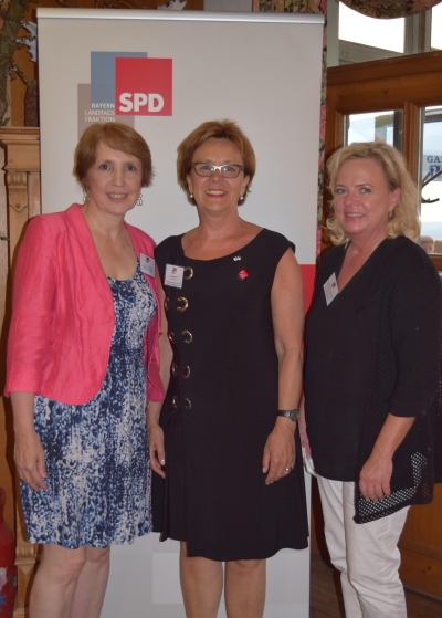 MdL Annette Karl, Ingrid Asche, 1. Vorsitzende BPW Regensburg, MdL Alexandra Hiersemann (v.l.n.r.)Im Jahr 2015 haben Frauen die ersten 79 Tage praktisch umsonst gearbeitet. Daher markierte in diesem Jahr der 20. März 2015 den Equal Pay Day. Dieser Tag ist der symbolische Stichtag im Jahr 2015, bis zu dem Frauen rein rechnerisch gehaltslos tätig waren. Ein Grund dafür ist der immer noch bestehende Verdienstunterschied zwischen Männern und Frauen. Denn bisher ist es der Politik – trotz aller Bestrebungen – noch nicht gelungen, alle Hürden für eine völlige Gleichstellung zu überwinden. Auch die Arbeitsgemeinschaft Frauenpolitik der BayernSPD Landtagsfraktion beschäftigt sich seit langem mit der Problematik. Daher luden MdL Annette Karl, wirtschaftspolitische Sprecherin der BayernSPD Landtagsfraktion und MdL Alexandra Hiersemann, Mitglied der Arbeitsgemeinschaft Frauenpolitik, am Freitag, den 3. Juli 2015, Unternehmerinnen und Handwerkerinnen aus der Oberpfalz zu einem Networking Abend ins Tagungshotel Schönblick nach Neumarkt i.d. OPf. ein. Denn im Fokus des Abends sollte nicht nur der Austauschen zwischen den Mandatsträgerinnen und den Frauen stehen, sondern auch der direkte Erfahrungsaustausch zwischen den Business Women.