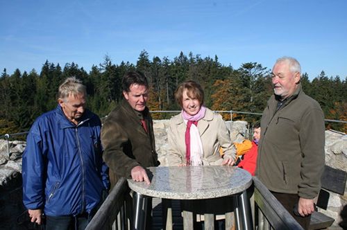 Die erste Station der Exkursion durch den Steinwald war die Burgruine Weißenstein. Burgbesitzer und Naturpark-Vorsitzender Eberhard Baron von Gemmingen-Hornberg ging auf die lange Geschichte und die große Bedeutung der Burganlage in früheren Zeiten ein. Durch die unermüdliche Arbeit der Gesellschaft Steinwaldia wurde die Ruine in den vergangenen Jahren aus dem Dornröschenschlaf geweckt. Nun zeigt sich der einstige Herrschaftssitz derer von Nothafft wieder als imposantes Baudenkmal. Die Burgruine ist heute eine der wichtigsten touristischen Ziele im Naturpark Steinwald. Die bekannten Weißenstein-Konzerte und andere kulturelle Veranstaltungen ziehen in den Sommermonaten wahre Besuchermassen an. Diese und andere Highlights im Naturpark sind Teil des Besucherlenkungskonzeptes, erklärte Baron von Gemmingen-Hornberg. Wir versuchen die Besucher ganz gezielt an bestimmte Punkte zu führen. Andere, sensible Bereiche des Naturparks werden dagegen gänzlich verschont. Hier finden seltene Tierarten, wie das scheue Auerwild, ihren Lebensraum.