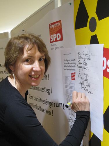 Unterschrift für die MassenpetitionDie Neustädter Landtagsabgeordnete und stellv. Vorsitzende der Bayern-SPD war am Mittwoch eine der ersten Unterzeichnerinnen des Aufrufs der Bayern-SPD zu einer Massenpetition der Menschen in Bayern an den Bayerischen Landtag gegen den von Union und FDP geplanten Ausstieg aus dem Atomausstieg.