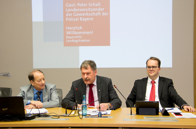 Schall warnte, schon jetzt sei die Polizei im Freistaat unterbesetzt. Allein um die Belastungen durch Sondereinheiten und Zusatzaufgaben zu kompensieren, müssten nach seiner Analyse 5000 neue Stellen geschaffen werden. Die Personalstärke sei seit 30 Jahren nicht ausreichend an die gestiegene Bevölkerungszahl und neue Kriminalitätsfelder wie Online-Betrug angepasst worden, monierte der Polizeigewerkschafter. Der Polizeiexperte Gantzer versicherte, die SPD stehe hinter der Gewerkschaft bei ihren Forderungen für mehr innere Sicherheit und mehr Personal.