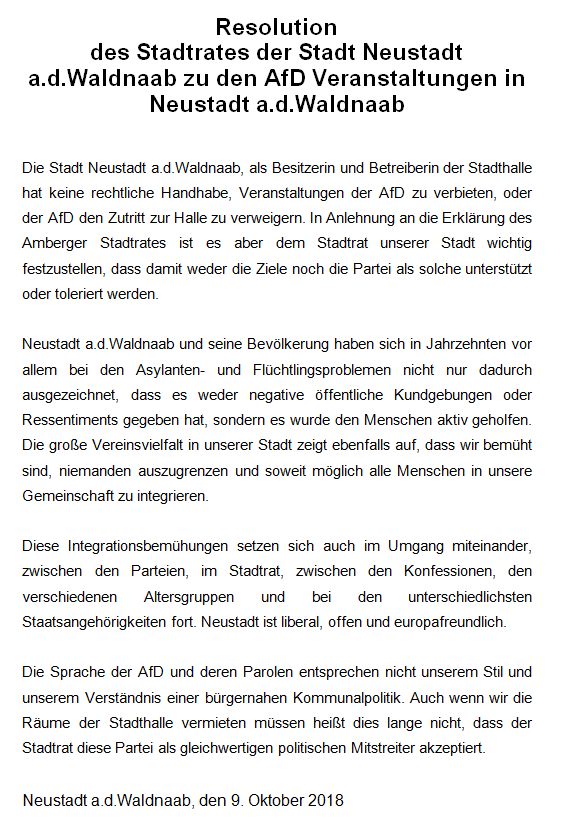 Die Stadt Neustadt a.d.Waldnaab, als Besitzerin und Betreiberin der Stadthalle hat keine rechtliche Handhabe, Veranstaltungen der AfD zu verbieten, oder der AfD den Zutritt zur Halle zu verweigern. In Anlehnung an die Erklärung des Amberger Stadtrates ist es aber dem Stadtrat unserer Stadt wichtig festzustellen, dass damit weder die Ziele noch die Partei als solche unterstützt oder toleriert werden.