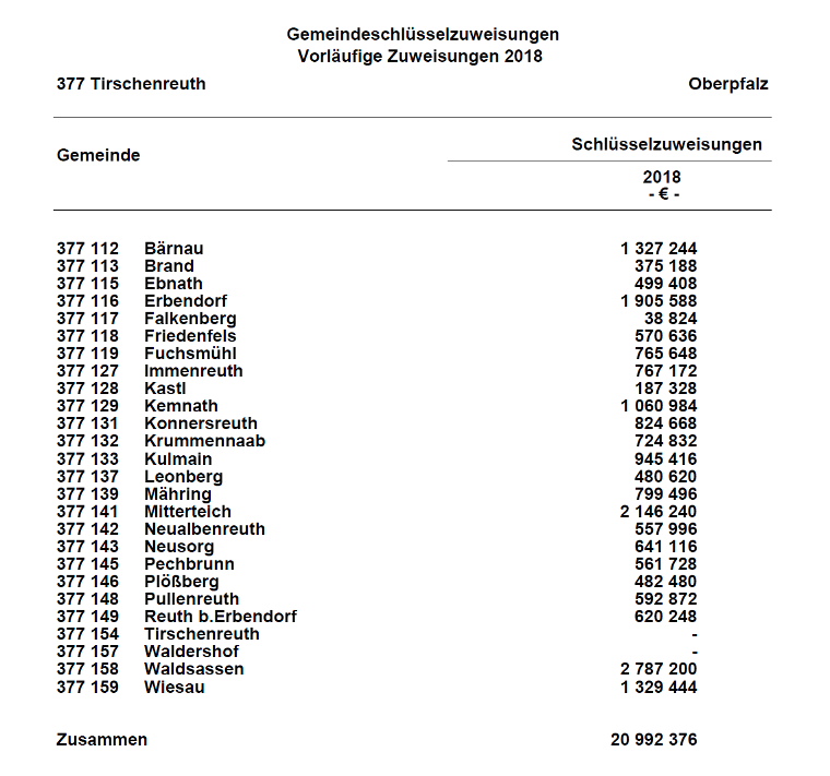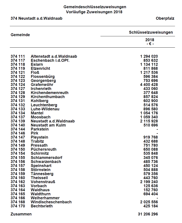 Die kreisangehörige Gemeinden in den Landkreisen insgesamt im Kreis Neustadt a.d. Waldnaab 31.206.296 Euro und im Kreis Tirschenreuth 20.992.376 Euro. Die Stadt Weiden i.d. Opf. erhält 21.705.584 Euro. An den Landkreis Neustadt a.d. Waldnaab gehen 17.761.948 Euro und an den Landkreis Tirschenreuth 12.808.744 Euro an Schlüsselzuweisungen in diesem Kalenderjahr.