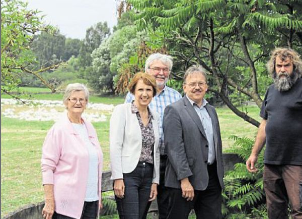 Landtagsabgeordnete Annette Karl (Zweite von links) und SPD-Bezirkstagskandidat Nobert Freundorfer (Zweiter von rechts) vom Besitzer der Geflügelfarm, Wolfgang Paulus (rechts). Mit dabei waren auch SPD-Chef Willy Koegst (Mitte) und Seniorenbeauftragte Gertraud Eichmann (links).