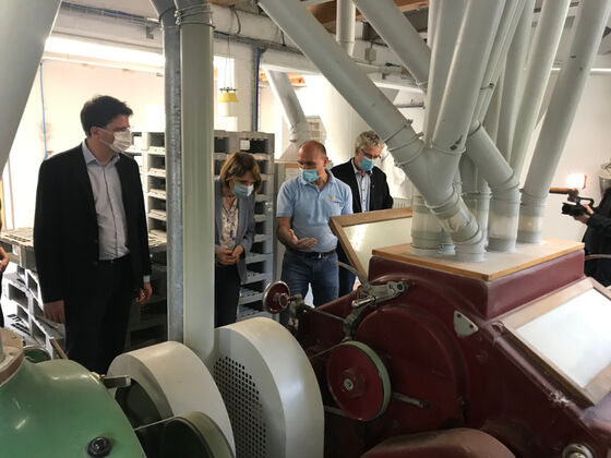 Das Getreide, das in der zu 2/3 mit Strom aus Wasserkraft angetriebenen Mühle gemahlen wird, kommt aus der Oberpfalz und Oberfranken. Erster Bürgermeister Robert Lindner konnte berichten, dass er als Bub noch mit seinem Vater zu der Mühle gefahren sei, um das Getreide abzuliefern. Dr. Josef Rampl vom Bayerischen Müllerbund gab den beiden Abgeordneten Karl und von Brunn zwei wichtige Themen für die parlamentarische Arbeit im Landtag mit: Zum einen soll durch eine EU-Richtlinie die Kennzeichnung von alten Getreidesorten geändert werden, um den Verbraucher auf Unverträglichkeiten hinzuweisen. Zum Beispiel soll aus Dinkel Dinkel-Weizen werden, was vom Verband als nicht notwendig angesehen wird und die Verbraucher verunsichern würde. Der zweite Auftrag befasst sich mit der Wasserkraft, die für die mittelständischen Mühlen enorm wichtig ist, um die Betriebskosten gering zu halten. Dabei sollte beachtet werden, dass die Mühlen schon seit vielen Jahrhunderten die Wasserkraft nutzen und der Rückgang der Fischbestände in den Wasserläufen viele Ursachen hat.