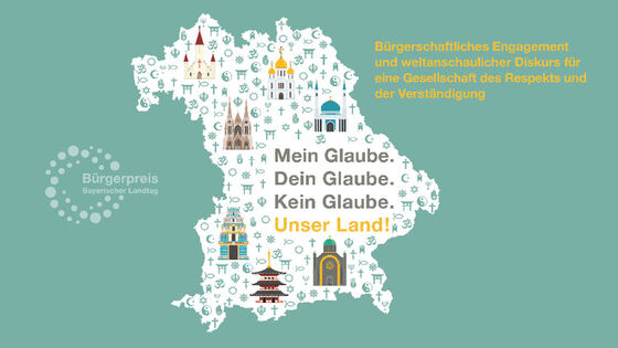 Noch bis zum 08. Mai sind Bewerbungen für den Bürgerpreis des Bayerischen Landtags möglich. Im Jahr 2017 ist der mit 50.000 € dotierte Ehrenamtspreis unter dem Leitthema "Mein Glaube. Dein Glaube. Kein Glaube. - Unser Land! Bürgerschaftliches Engagement und weltanschaulicher Diskurs für eine Gesellschaft des Respekts und der VErständigung" ausgeschrieben. Die Glaubens- und Religionsfreiheit sind zentrale Grund- und Menschenrechte in unserer Demokratie. Geprägt ist unser Zusammenleben dennoch von Religionen und Weltanschauungen und bilden die Grundlage für viele Frauen und Männer sich ehrenamtlich einzubringen. Für andere Menschen, für das friedliche Miteinander verschiedener Glaubensrichtungen, für die gemeinsame Gestaltung unserer Heimat.